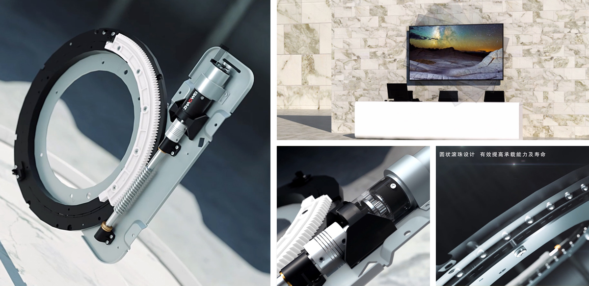 产品说明:电视机智慧屏翻转驱动系统通过行星齿轮箱和齿轮圆弧圆周运动,提升电视机屏幕的智能翻转,提高了产品运动的稳定性,降低使用过程中的噪音。